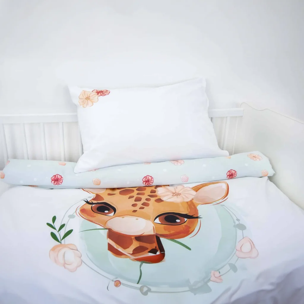 Diese liebevoll gestaltete Bettwäsche mit süßem Giraffen-Motiv sorgt für ruhige und entspannte Nächte bei Babys und Kleinkindern.