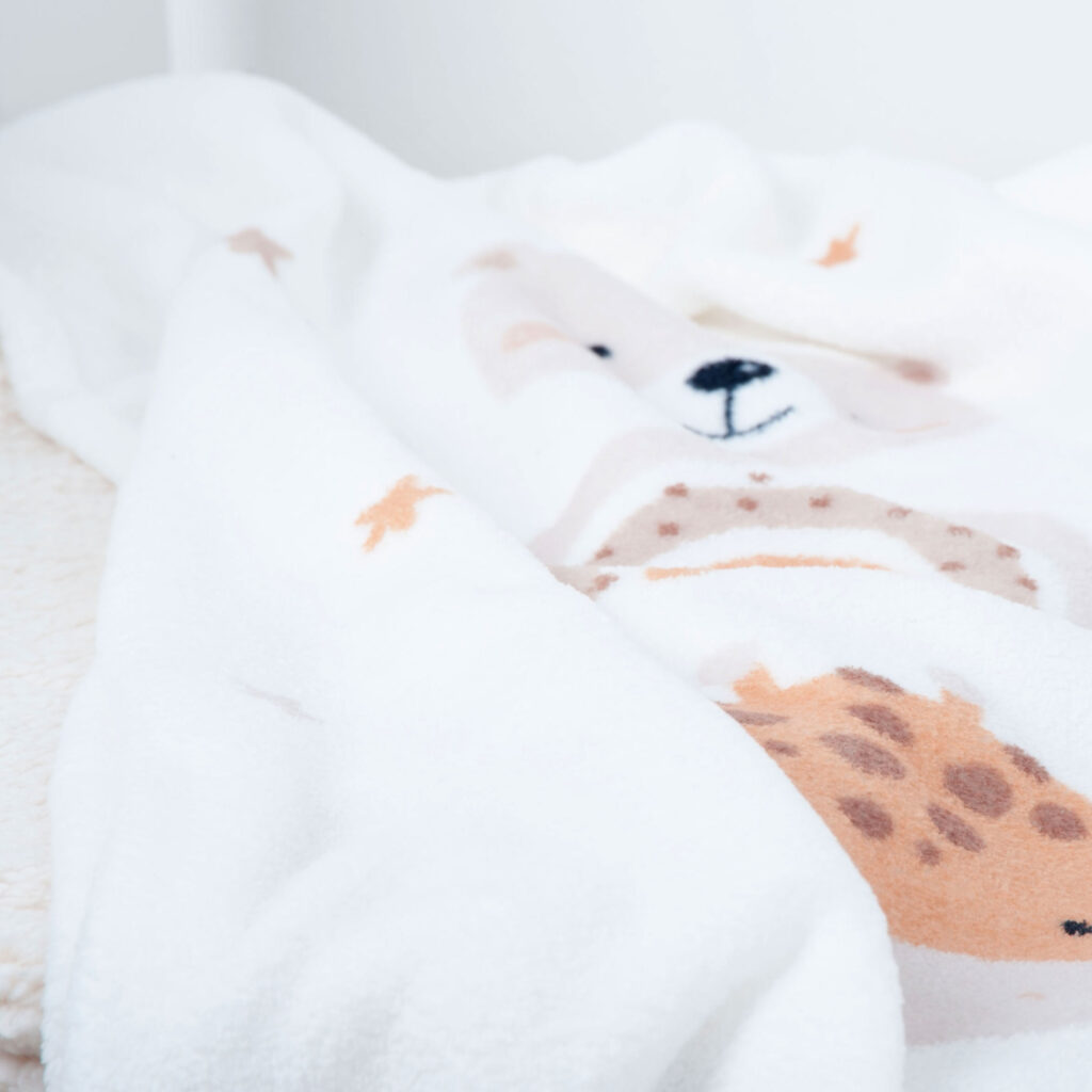 Diese Kuscheldecke mit liebevollen Tiermotiven begleitet Babys beim Spielen, Schlafen und Kuscheln.