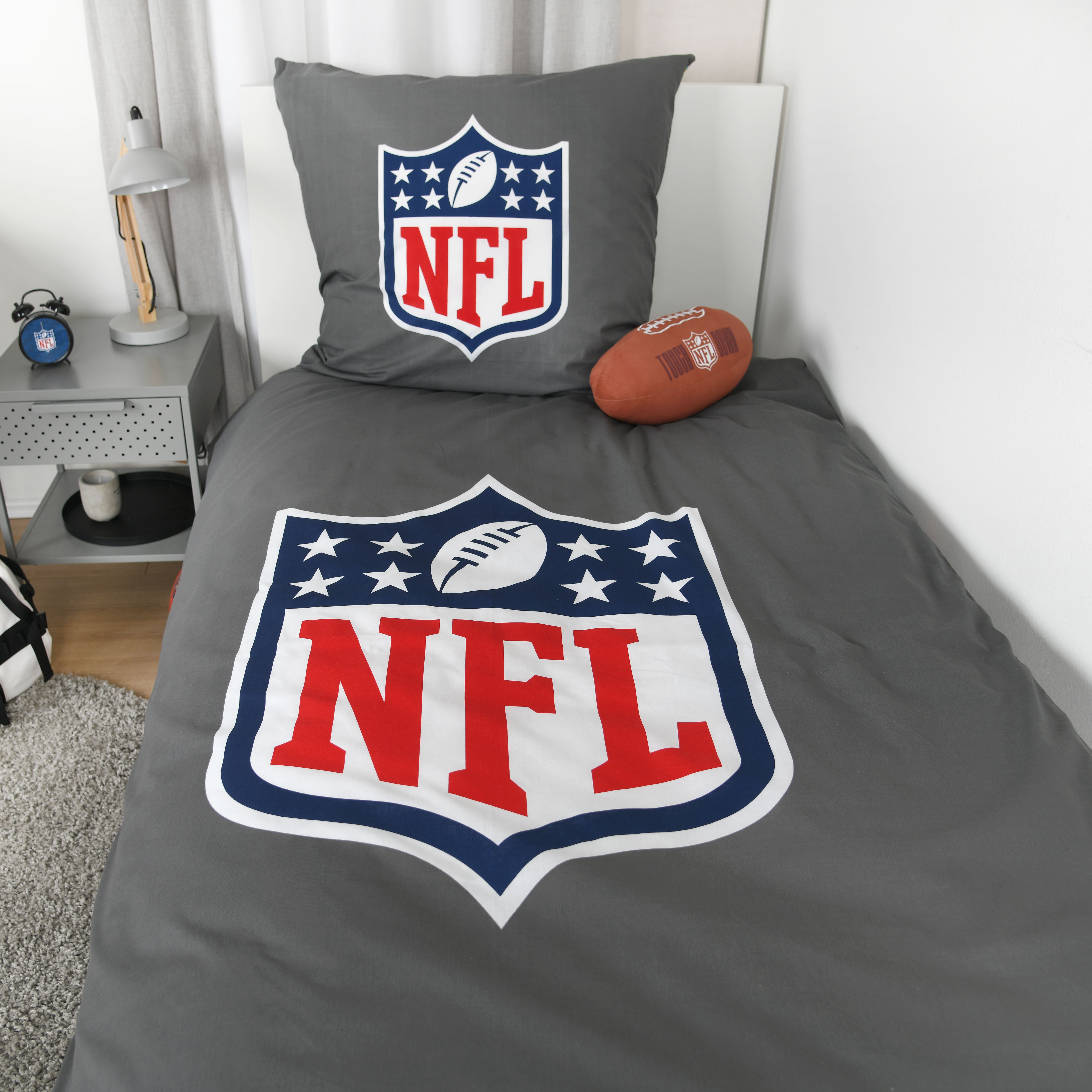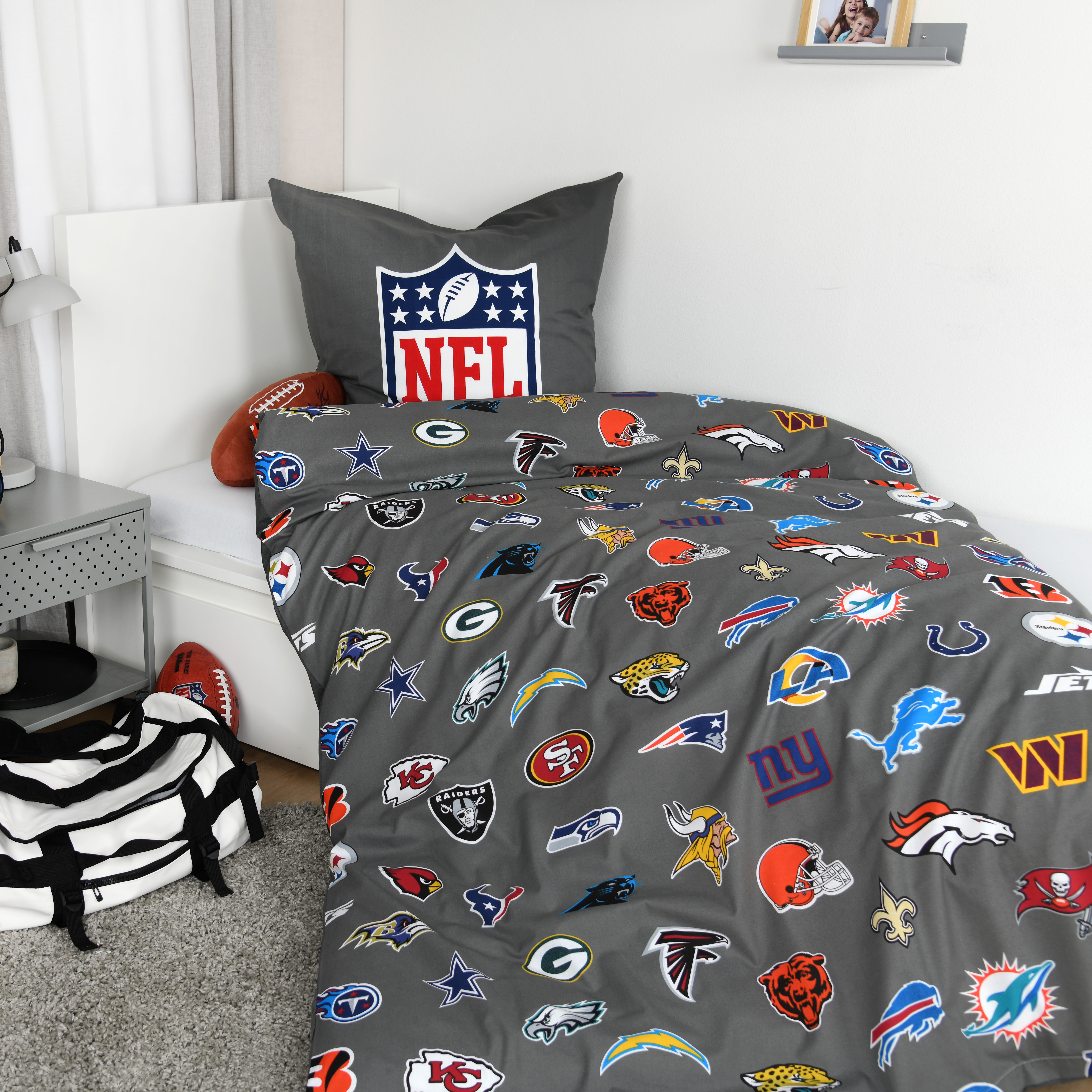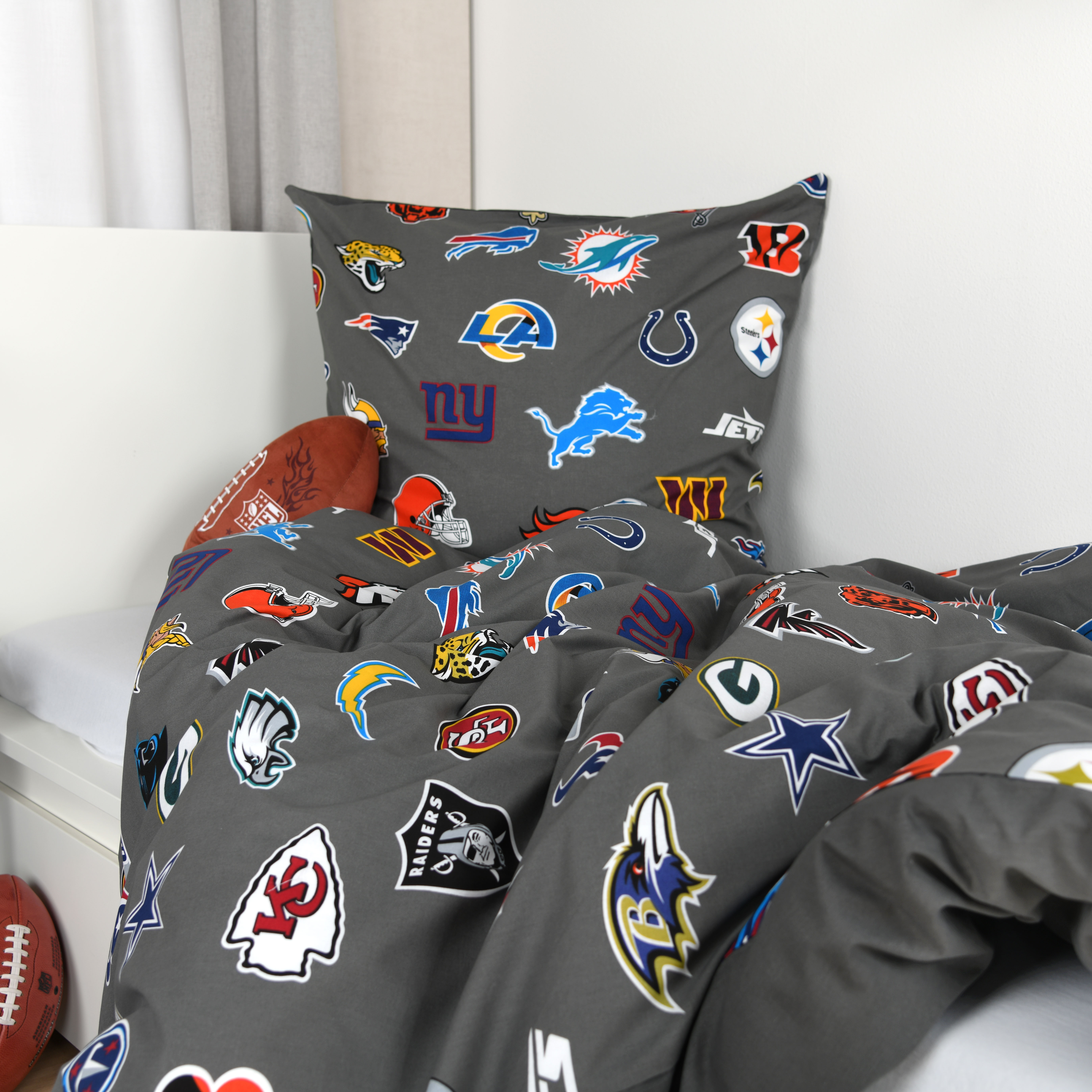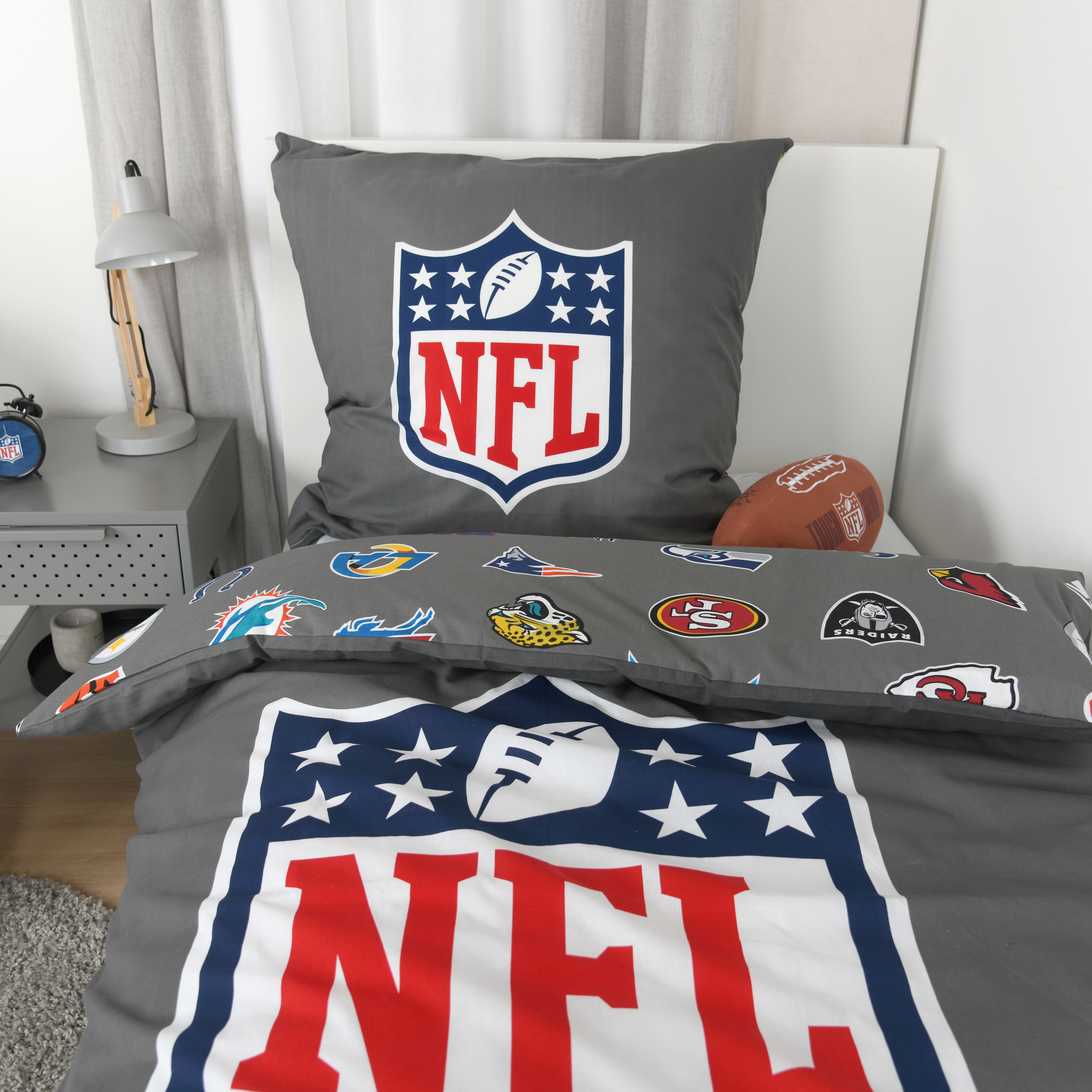 Die NFL Bettwäsche ‘All Teams Grey’ bringt Football-Feeling ins Schlafzimmer.