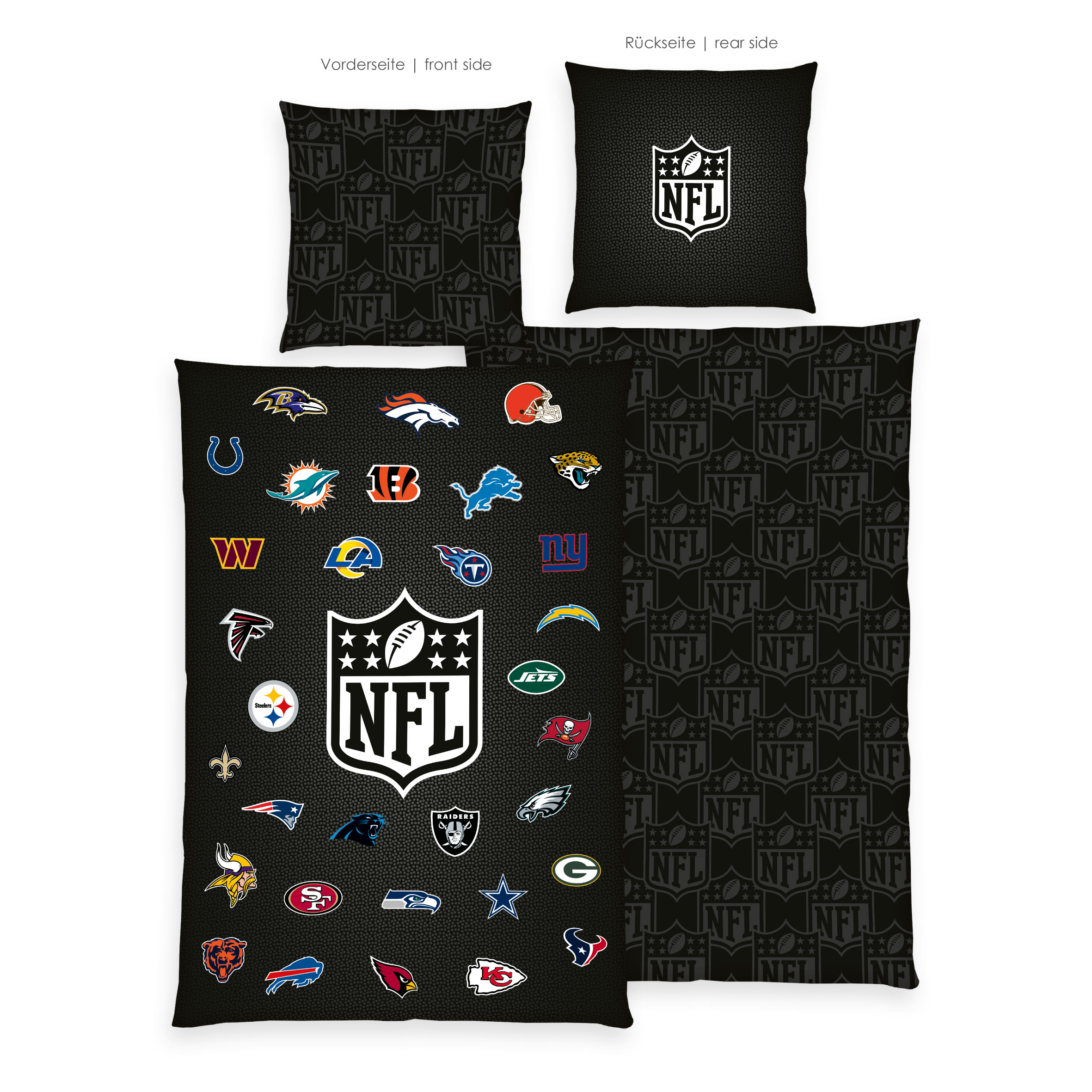 Alle Produkte > Sets > NFL Fanpaket – Bettwäsche-Set ‘All Teams’ 135×200 cm + Kuscheldecke ‘All Teams’ 150×200 cm + ‘Football’ Formkissen