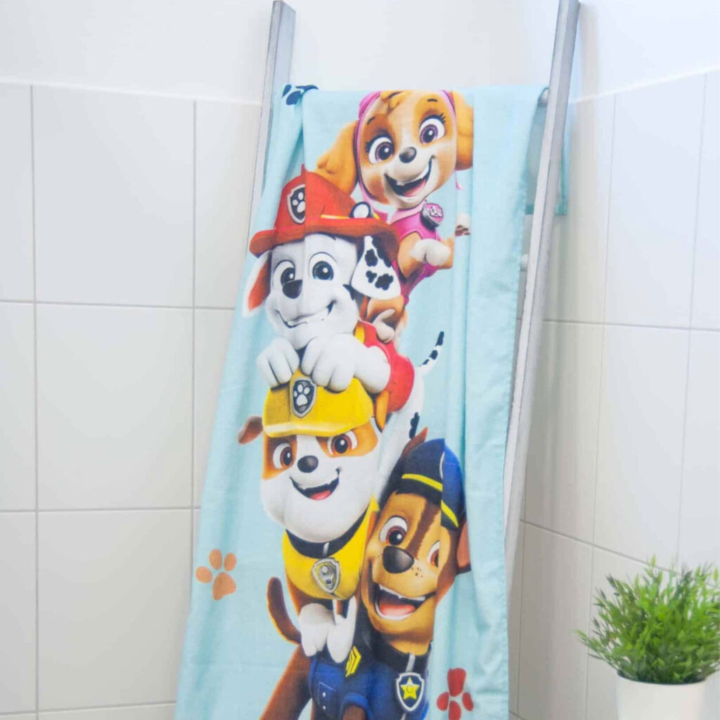 Mit diesem Handtuch begleitet dich die beliebte Paw Patrol-Truppe ins Badezimmer, an den Strand oder ins Schwimmbad.