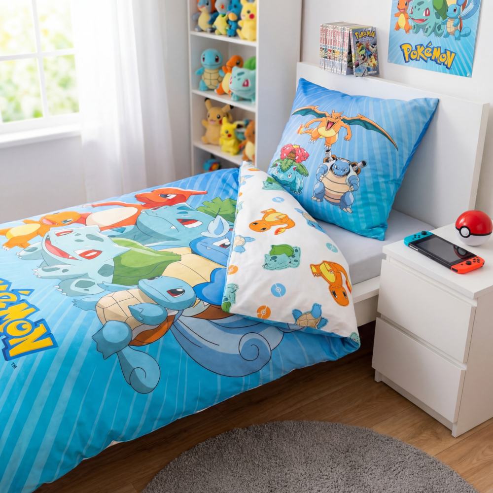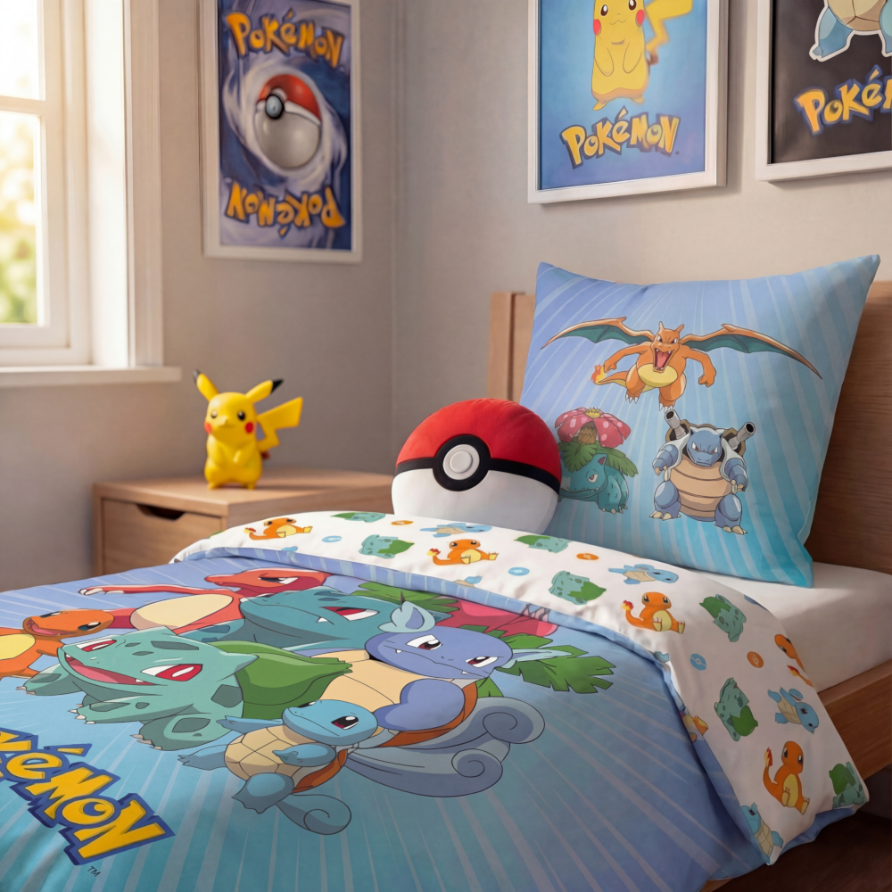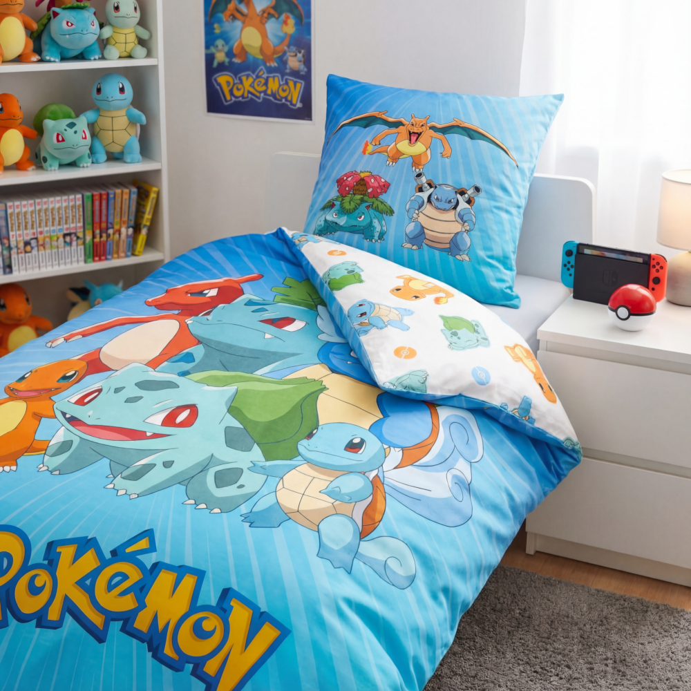 Mit dieser farbenfrohen Bettwäsche ziehen Pikachu, Glurak, Turtok und Bisaflor direkt ins Kinderzimmer ein. Das lebendige Design begeistert kleine Pokémon-Fans und macht das Zubettgehen zum Abenteuer.
