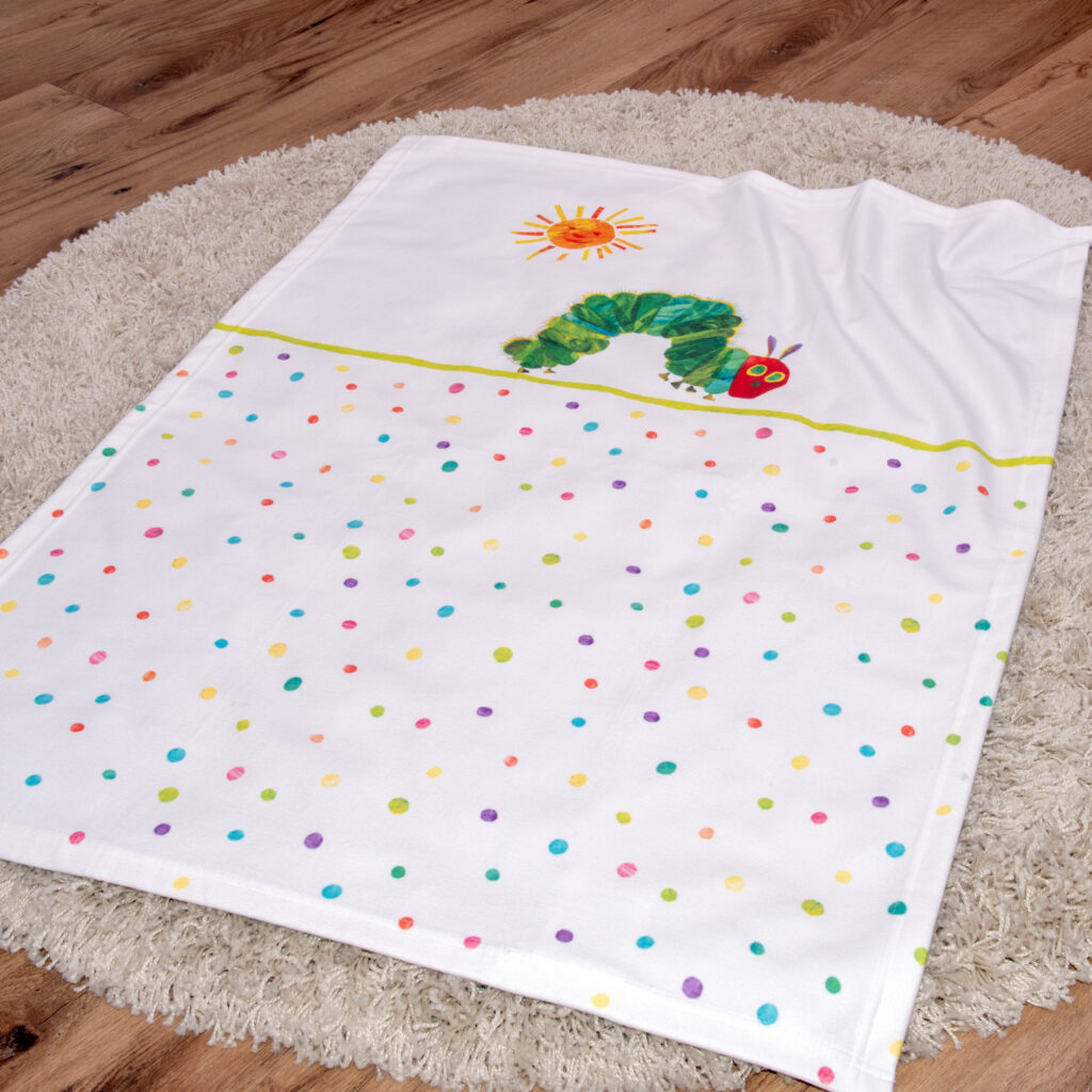 Eine besonders weiche Soft-Peach-Decke (ca. 75 × 100 cm), die sanft auf der Babyhaut liegt. Sie hält angenehm warm, ist atmungsaktiv und ideal für Kinderwagen, Wiege oder Babyschale. Die farblich harmonische Gestaltung mit dem ikonischen Raupe-Nimmersatt-Motiv macht sie zum dekorativen Highlight. -