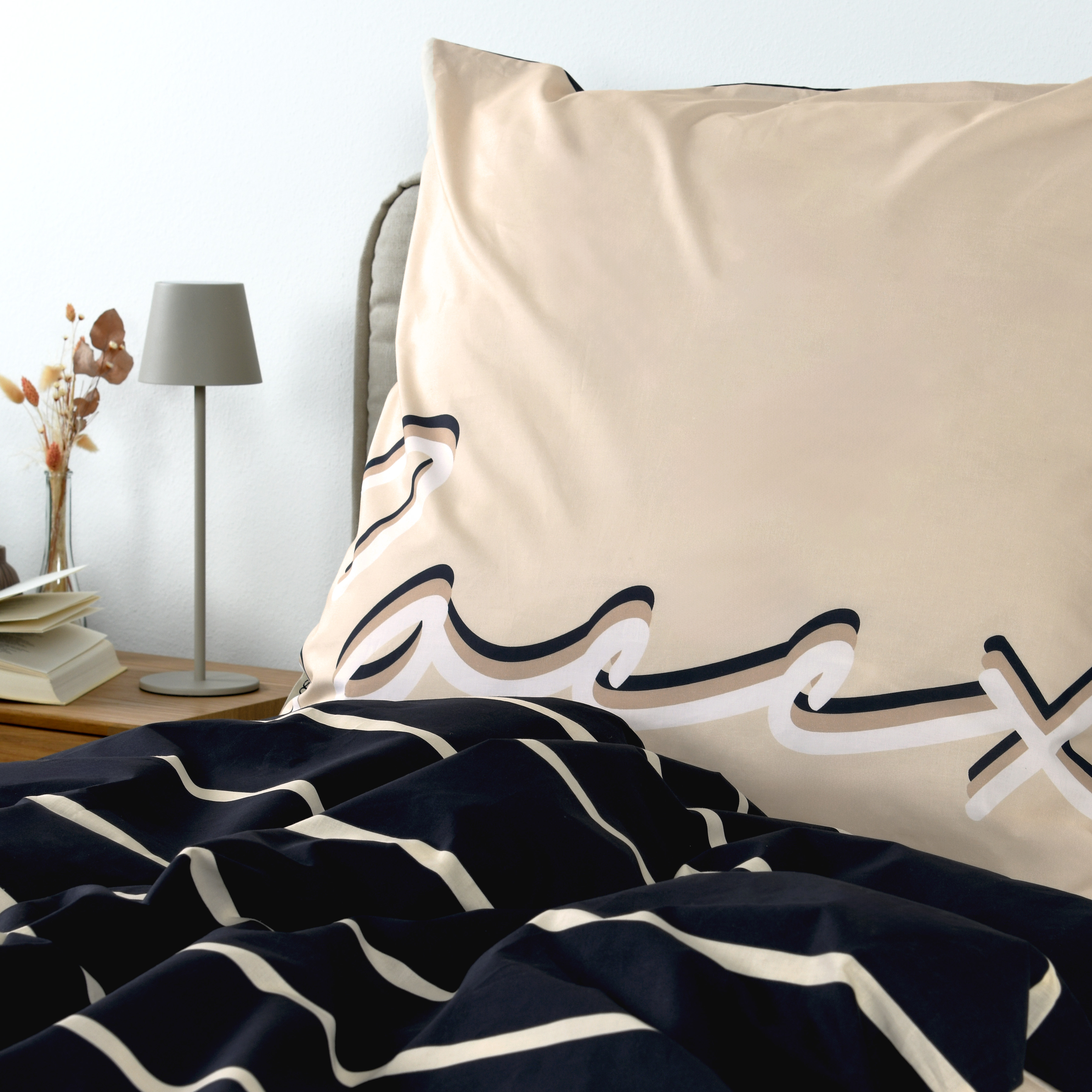 Maritimer Lifestyle fürs Schlafzimmer: Das SOCCX Bettwäsche-Set Coastal Stripes kombiniert klassische Streifen in Dunkelblau mit einem hellen Uni-Ton und markanter Statement-Typografie. So wirkt das Design sportlich, modern und gleichzeitig angenehm ruhig – perfekt für einen frischen Look auf dem Bett.